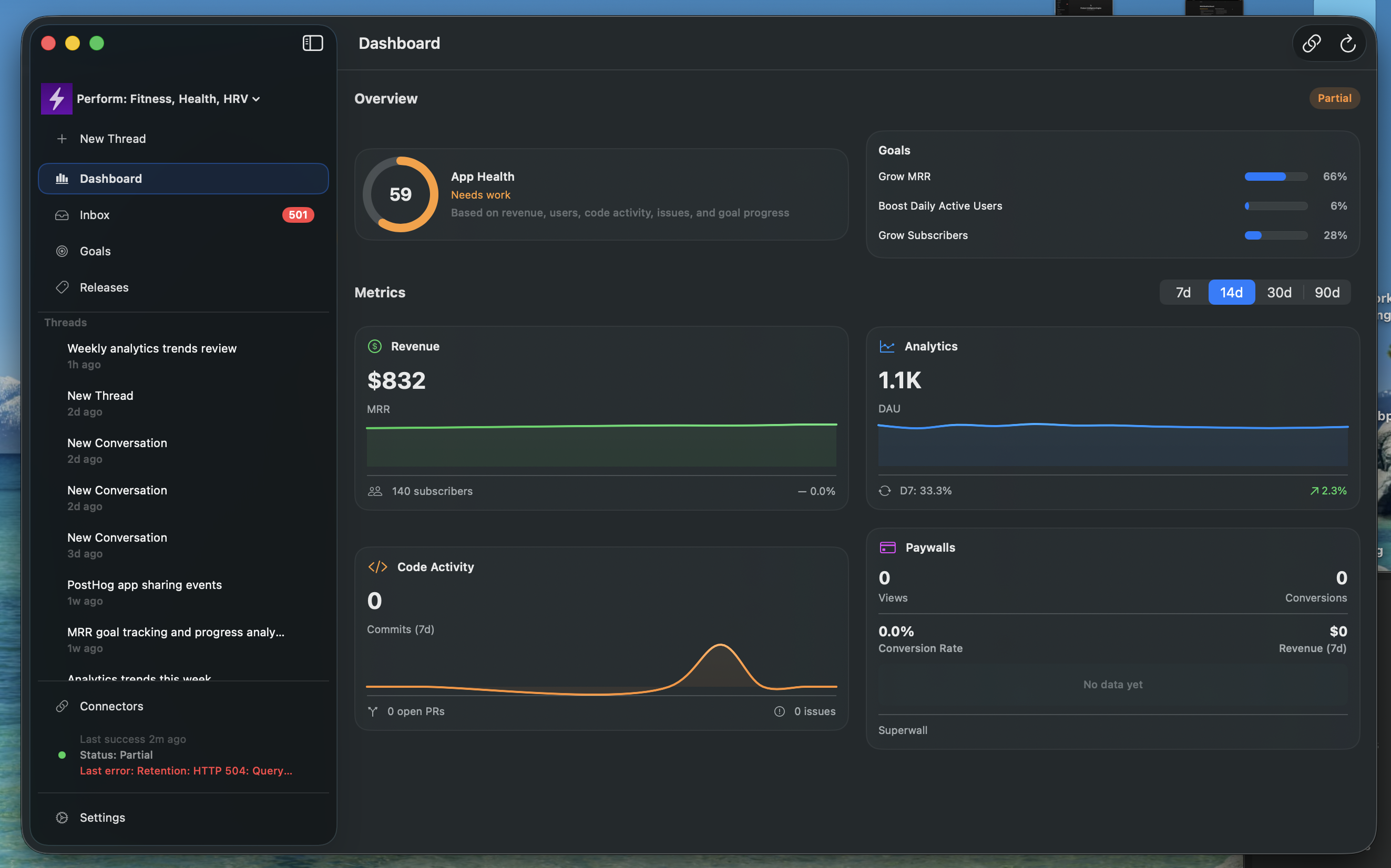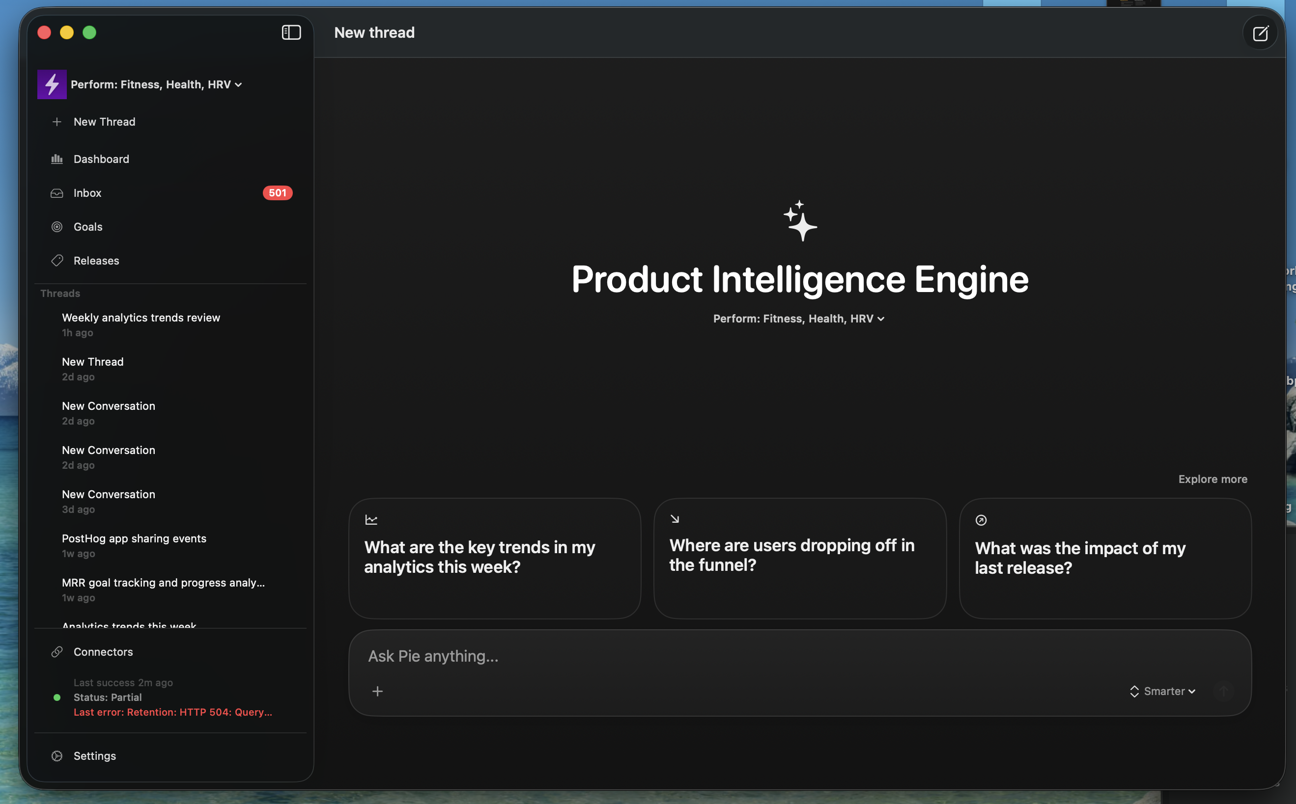 Pie is a native macOS app that acts as a product management and product health agent for app developers. It connects to the tools developers already use (PostHog, RevenueCat, Superwall, GitHub, App Store) and uses Claude's agentic tool-use API to monitor metrics, investigate anomalies, correlate code changes with metric shifts, and tell you exactly how to improve your app through a chat-first interface.