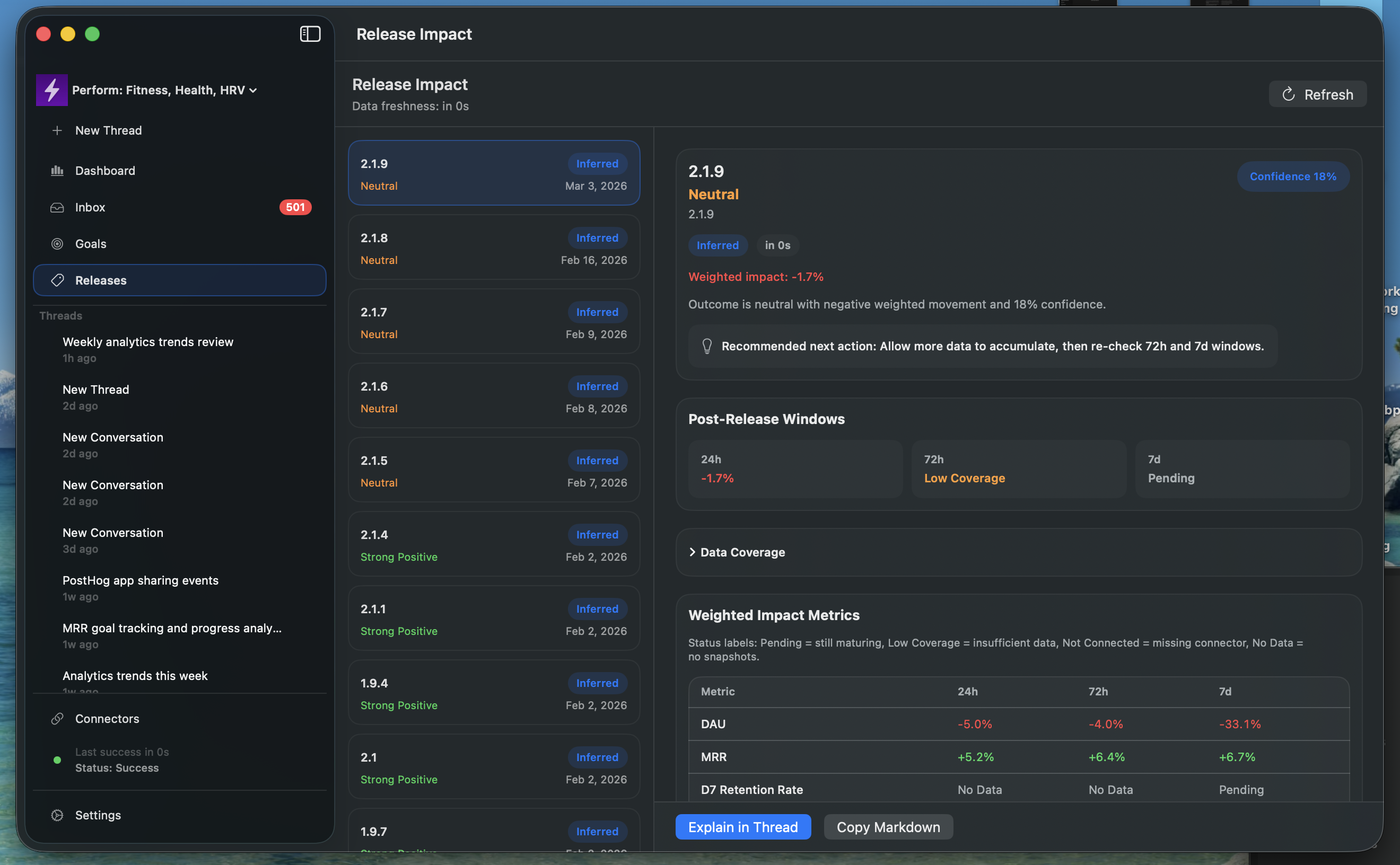 The standout feature is Release Impact. Every time you ship a new version, Pie automatically computes a weighted impact score by comparing pre-release baseline metrics to post-release performance across multiple time windows. It detects confounding factors like nearby releases or missing metric coverage, and gives you a clear, honest read on whether your release actually moved the needle. No more guessing if that refactor helped or if your new onboarding flow converted better.