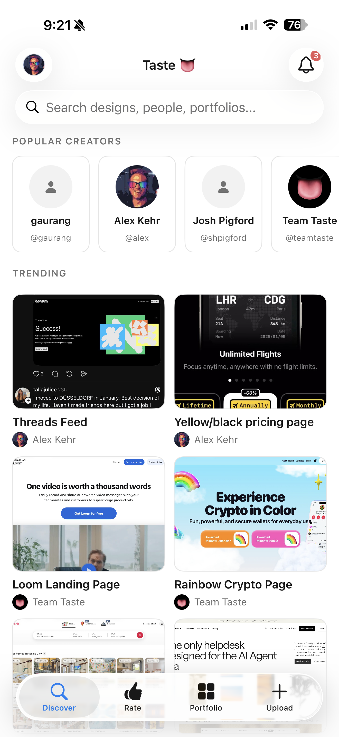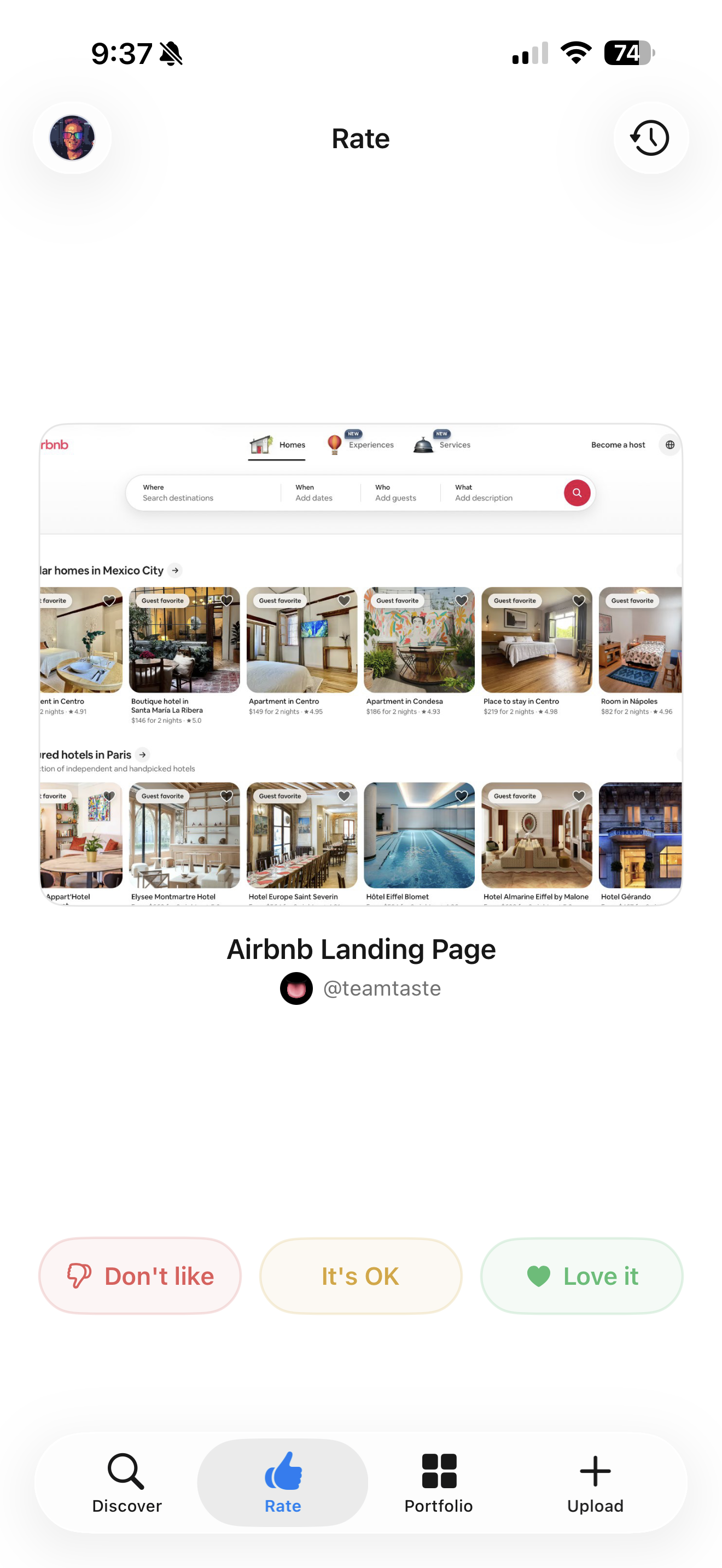 Across your library, those signals collapse into a compact, versioned Taste Profile: a qualitative summary of your sensibility, plus per-category scoped profiles (navigation, dashboards, forms, onboarding...), plus an explicit anti-preferences block built from designs you've rejected. Rate any AI-generated screen "nailed it", "close", or "missed" and that feedback pipes directly into the next synthesis pass, delivering prompt-level RLHF for your design taste with no model fine-tuning. Your personal taste is modeled as a 6-dimensional taste vector with confidence per dimension, and every swipe on a community design becomes a stored preference pair with an Elo score. It's a structured preference-learning system where the product happens to be the dataset.